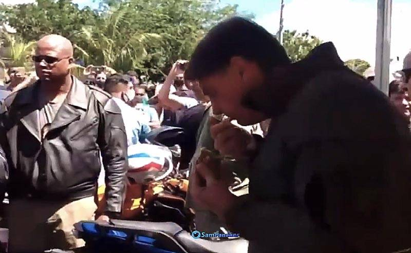 Sem máscara e causando aglomeração, o presidente Jair Bolsonaro pediu para entrar em uma tenda que vende frango assado na periferia de Brasília.