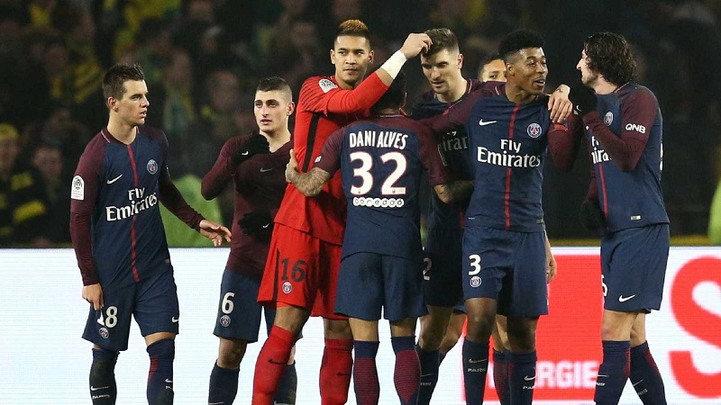 Marquinhos e Daniel Alves se uniram a todos os argentinos e ao uruguaio Edinson Cavani para celebrar a abertura do placar diante da torcida visitante que marcava presença no estádio do Nantes.