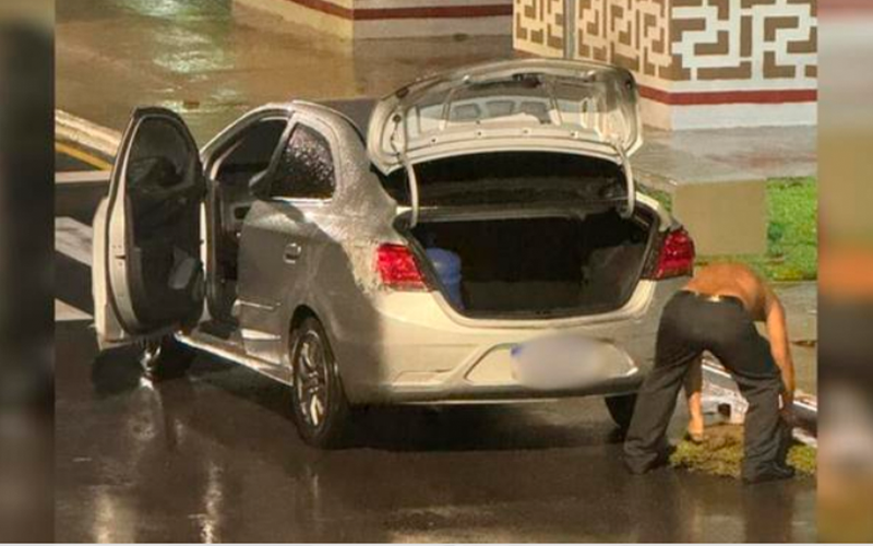 Nas imagens visualizadas nas redes sociais, é possível observar que o homem abre as portas de um carro de passeio, retira parte da grama da praça e coloca o material no interior do veículo. Isso tudo, sob chuva, tanto que o homem está sem camisa. Ao final da ação, ele entra no carro e deixa o local.