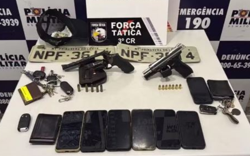 No carro foram encontrados um revólver com cinco munições intactas no assoalho, duas placas veiculares e sete celulares. A PM constatou que o veículo ainda estava com a placa original.