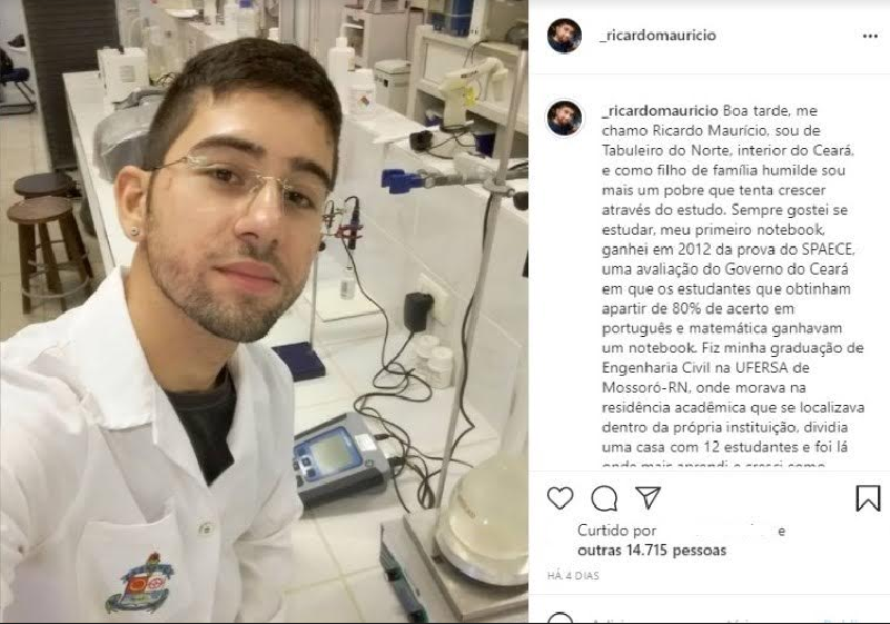 Ricardo é graduado em Engenharia Civil, onde cursou na UFERSA de Mossoró-RN. Agora, foi aprovado no mestrado na Universidade Federal do Ceará. Como seu único equipamento de estudo queimou, ele ficou impossibilitando de acompanhar as aulas remotas, essenciais para a sua pesquisa.