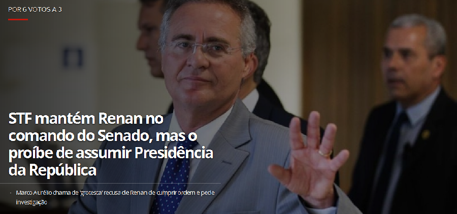 Em julgamento, seis ministros derrubaram liminar do ministro Marco Aurélio Melo para retirar Renan Calheiros da presidência do Senado; três votaram pelo afastamento imediato.