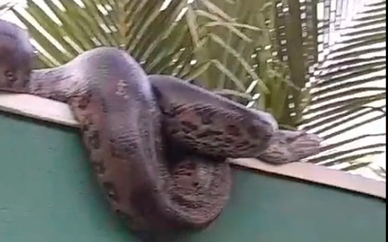 Sucuri de 5 metros é resgatada em cima de muro no Mato Grosso; vídeo