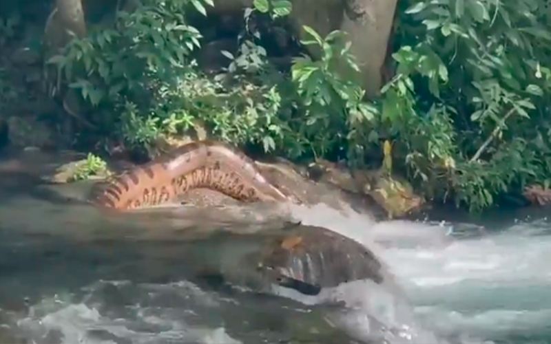 Nas imagens registradas, a sucuri desliza tranquilamente por uma queda d’água, seguindo suavemente o fluxo do rio. A espécie, não peçonhenta, é a maior serpente do Brasil e habita principalmente as margens de rios e igarapés. Sua dieta é carnívora, alimentando-se de peixes e rãs, e ocasionalmente caça animais que se aproximam das margens dos corpos d’água.