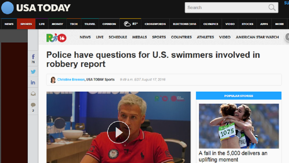 Nesta quarta-feira, o jornal americano USA Today também trata do caso e fala sobre boatos que de mandados de prisão teriam sido expedidos contra os nadadores. O veículo apresenta posição oficial do Comitê Olímpico dos Estados Unidos (USOC), que desmente a versão de que atletas tenham sido presos e garante continuar cooperando para solucionar o caso.