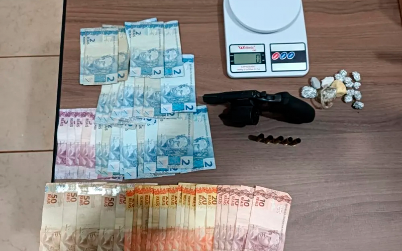 Arma, droga e dinheiro apreendidos | Foto: Reprodução