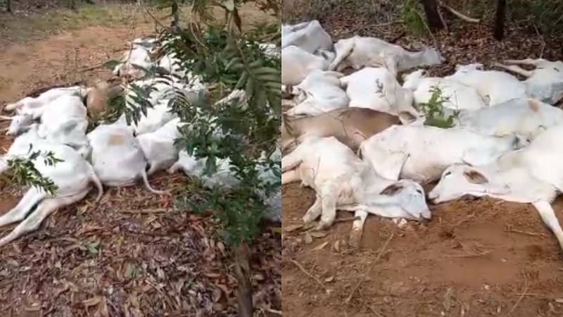 Devido às baixas temperaturas que permanecem em Mato Grosso do Sul, com média de 6°C e 12°C, situação é vista como obstáculo no campo. Essas imagens abaixo, que circulam pelas redes sociais, são de bois mortos em propriedade rural de Miranda, a 212 quilômetros da Capital.