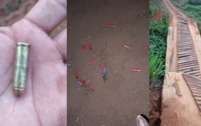 Da esq. à dir.: Munições encontradas nos ataques; ponte destruída. — Foto: Reprodução / Arquivo Pessoal