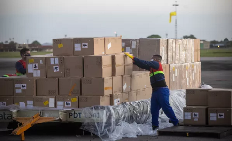 Respiradores comprados da China sendo descarregados no Pará. — Foto: Marco Santos/Agência Pará