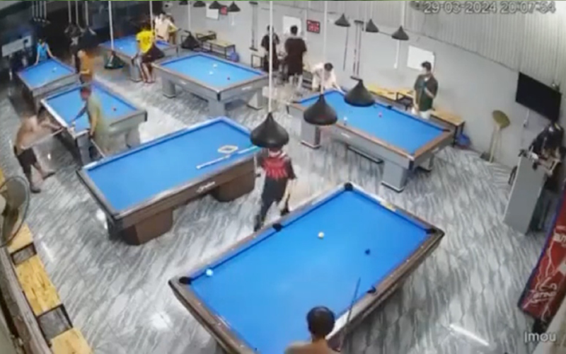 Um deles, o que aparece trajando uma camisa de cor marrom, agride o amigo usando o taco da sinuca. A partir deste momento, a situação fica mais tensa.