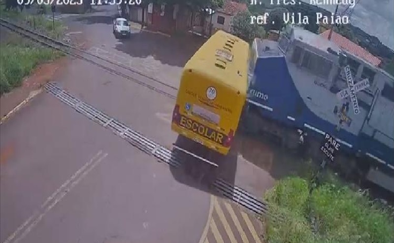 O momento do impacto foi registrado em um vídeo, que mostra o ônibus avançando na linha férrea enquanto um carro branco freia para o trem passar ao lado.