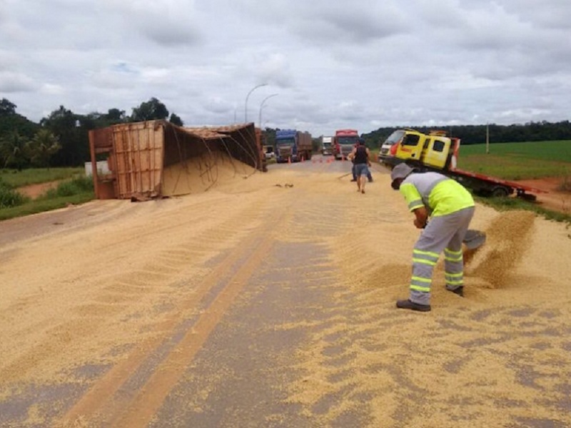 Funcionários da concessionária estão trabalhando para limpar a soja da pista. Posteriormente, será realizado o trabalho de destombamento da carreta e liberação da via.