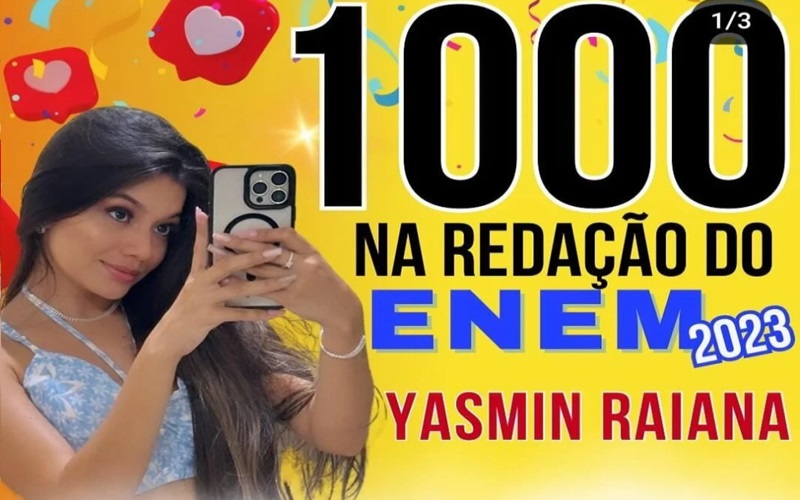 Yasmin Raiana é aluna do professor de redação Otávio Valente, que postou em suas redes sociais nesta terça-feira, 16, uma publicação revelando que a estudante tirou a nota máxima na redação, o que foi alcançada por somente 60 pessoas em todo o Brasil.