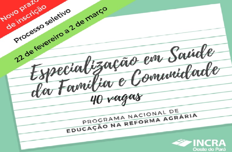 A Universidade Federal do Oeste do Pará (Ufopa) abre hoje (22) o segundo período de inscrições para o processo seletivo de candidatos ao curso de especialização em saúde da família e comunidade. O prazo se estende até o dia 2 de março. O curso é resultado de parceria com o Instituto Nacional de Colonização e Reforma Agrária (Incra), no âmbito do Programa Nacional de Educação na Reforma Agrária (Pronera).