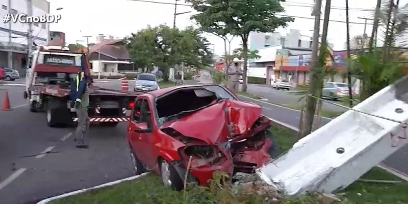 O acidente aconteceu por volta das 4h, quando o condutor do veículo perdeu o controle da direção, acertou o canteiro central e em seguida, o poste de energia, que inclinou e quase tombou para o outro lado da via.