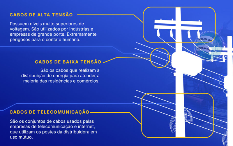 A fiação de telecomunicação costuma ser disposta na parte intermediária dos postes, enquanto a fiação de distribuição de energia, sob responsabilidade da Equatorial Pará, fica organizada na parte superior das estruturas.