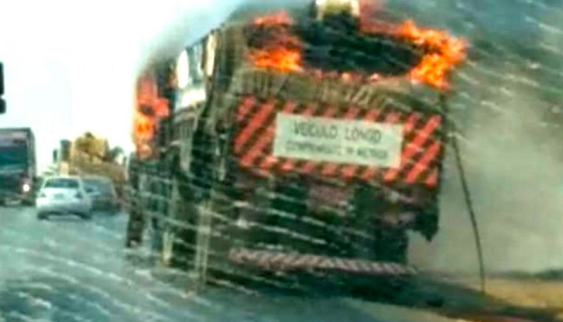 (Foto:Reprodução)-O Corpo de Bombeiros está tentando acabar com as chamas em um vagão de uma Iveco Strallis 410 branca, com placa de Três de Maio (RS), que pegou fogo, há pouco, na BR-163, entre Lucas e Mutum. Equipes da concessionária que administra a rodovia também estão no local sinalizando e dando apoio aos militares.
