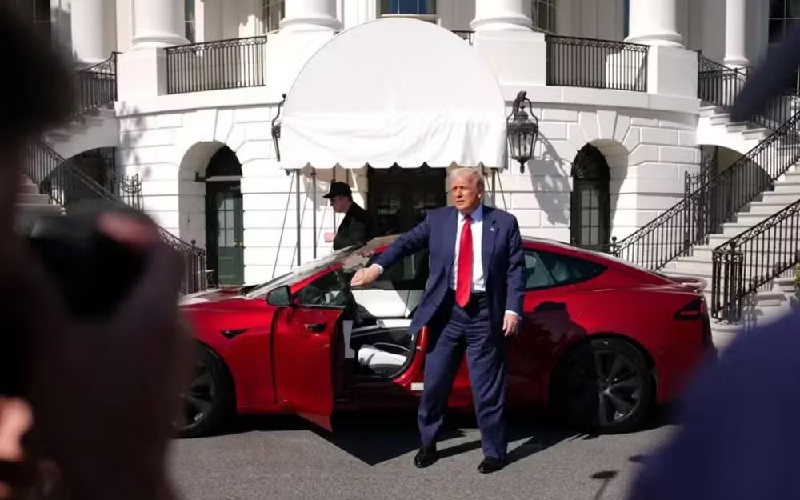 O presidente Trump ao lado de um Tesla em frente à Casa Branca — Foto: Getty Images via BBC