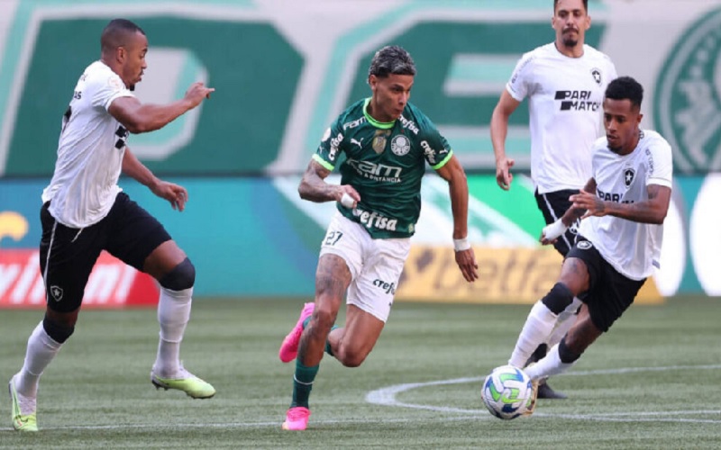O jogador Richard Ríos, da SE Palmeiras, disputa bola com o jogador do Botafogo FR, durante partida válida pela déciima segunda rodada, do Campeonato Brasileiro, Série A, na arena Allianz Parque. (Foto: Cesar Greco/Palmeiras/by Canon).