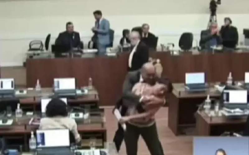 Câmeras que transmitiam a sessão da Câmara Municipal de Florianópolis nesta quarta-feira (7) mostraram o momento em que um vereador abraçou e beijou à força uma colega de parlamento.