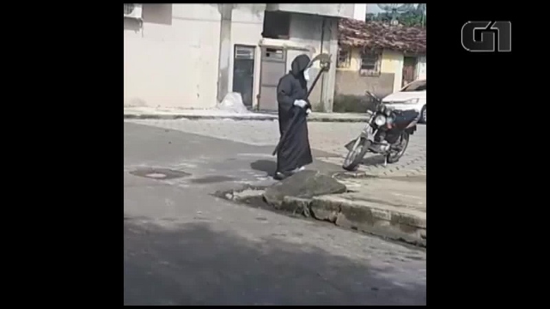 Usando roupa preta, segurando uma foice e com a máscara da personagem, ele chamou atenção de todos. A ideia era alertar para o risco de contaminação ao se aglomerar nas filas, mas as pessoas levaram a fantasia na brincadeira e pediram até para fazer foto com a “morte”.
