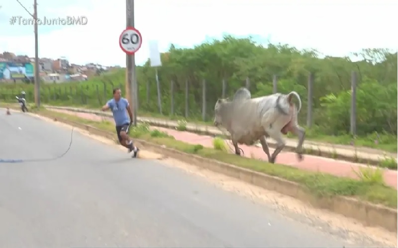 (Foto: TV Bahia) -Um boi solto em umas das principais avenidas de Salvador gerou transtornos para quem passava pela região de Piatã, na manhã desta terça-feira (24). O animal provocou um acidente, interrompeu o trânsito e ainda perseguiu um homem que tentava resgatá-lo.
