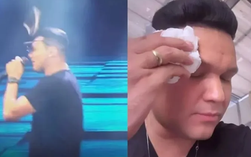 Cantor fica "P da vida" ao ser atingido por celular em show.