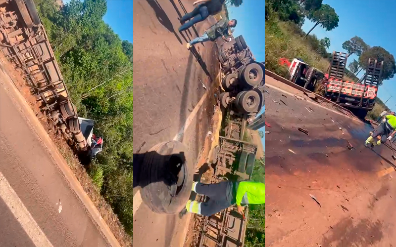 A colisão teria sido frontal e as duas carretas tombaram às margens da pista. Os reboques parcialmente ficaram sob a rodovia. A equipe da concessionária Via Brasil trabalha na limpeza dos destroços que ficaram na via e remoção dos veículos.