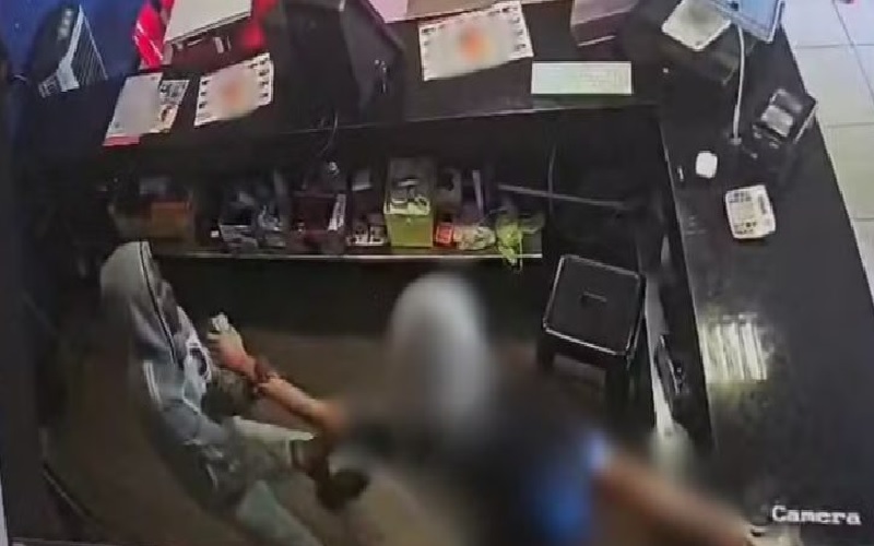 Nas imagens, o homem aparece fingindo estar armado antes de invadir o balcão, puxar a jovem pelos braços e levá-la até o banheiro do estabelecimento, onde, segundo a PM, ela foi agredida e violentada.