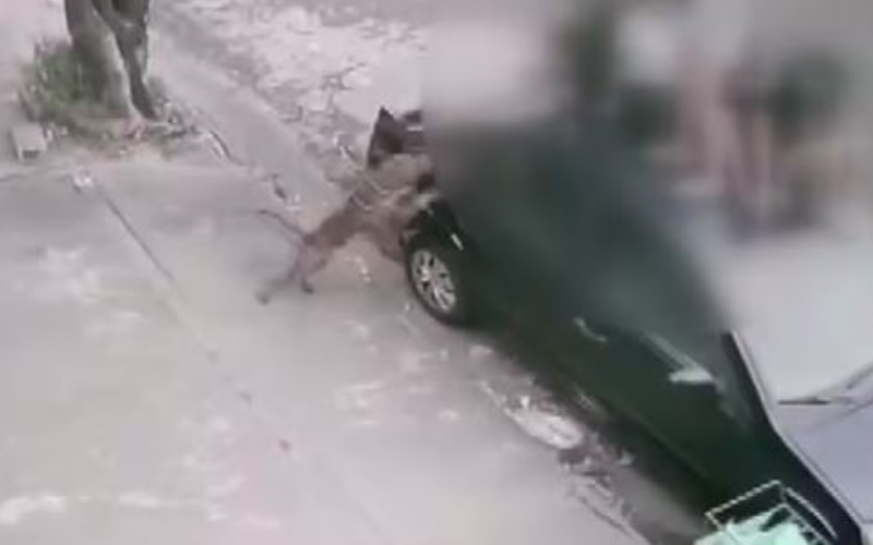 Nas imagens, é possível ver o animal, que fugiu de uma casa, segundo testemunhas, tentando subir também no carro para morder as pessoas.