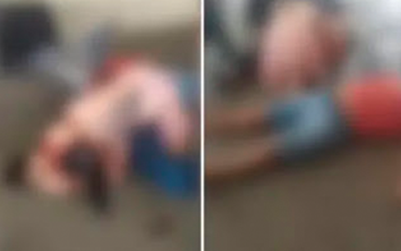 Um vídeo mostra o suspeito e a vítima caídos no chão do bar, e o homem já aparece desacordado. As imagens são fortes.
