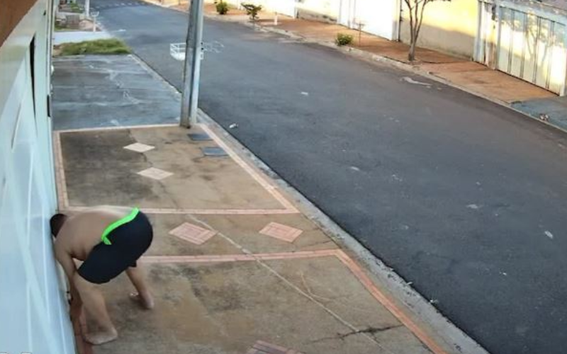 Câmeras de circuito interno de segurança mostram o momento que o homem tenta violar o portão da mulher. A vítima acionou a polícia, o homem entrou na casa travando uma perseguição contra a gestante.