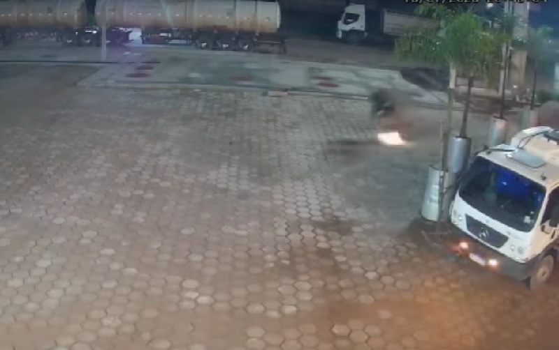 Um vídeo captado por câmeras de segurança registrou o momento que uma motocicleta em fuga da viatura da Polícia Militar colide com uma mureta em pátio de posto de combustível em Novo Progresso.