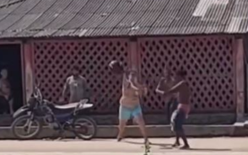Nas imagens, a mulher aparece agredindo o homem com um capacete, enquanto ele segura o que parece ser um facão ou pedaço de madeira. Logo em seguida, outra mulher corre atrás do homem, aparentemente para atacá-lo também.