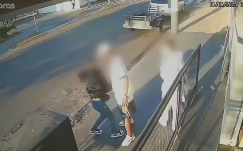 Uma outra câmera de segurança registrou também o momento em que a vítima, que estava acompanhada de um colega, da mesma idade, andava pela rua Fortunato Resta, no bairro Vila Maria, e foi abordada por Vitor na calçada. (Veja no vídeo abaixo).