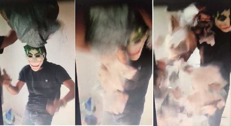 Nas imagens o suspeito aparece com uma máscara do vilão Coringa e uma outra pessoa segura um saco sobre sua cabeça, que abre e de dentro caem diversas notas de dinheiro. Em seguida, ele mostra o dedo do meio para a câmera. Segundo a Secretaria de Segurança, as cédulas que aparecem nas imagens foram roubadas nessa quarta-feira (21) do Banco do Brasil de Inhuma, Sul do Piauí.