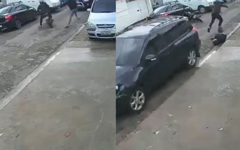 Após o impacto, ele ainda dá ré e passa novamente por cima do suspeito. O segundo homem abandona a moto, tenta pegar algo na cintura do comparsa caído, mas quase é atropelado também e acaba fugindo correndo.
