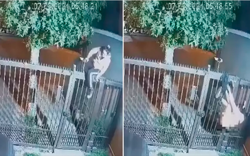Invasora acaba pendurada e seminua em portão de casa (Reprodução/Redes sociais)