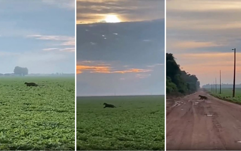 Na publicação feita pelo site Nortão MT no Instagram, o animal aparece correndo com certa tranquilidade em meio à soja. Após atravessar um trecho da plantação, ele passa por uma estrada de terra e foge em direção à mata.