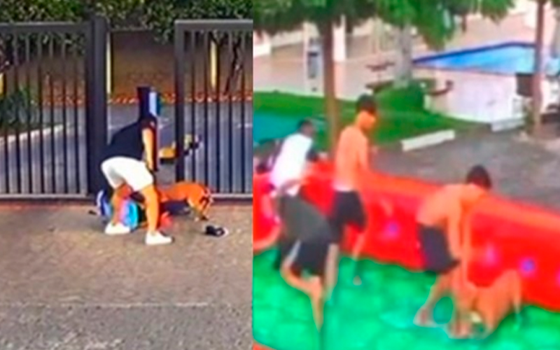 As imagens mostram o momento que o pit-bull invade a festa infantil e pula dentro de um brinquedo inflável, onde os adolescentes jogam futebol de sabão. Também mostram o momento que o porteiro foi perseguido, cai no chão e é atacado pelo animal.