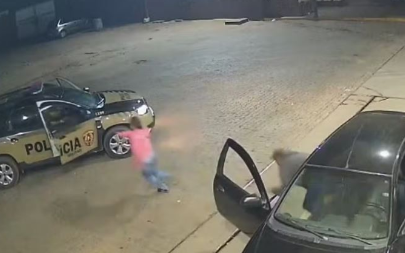 No vídeo, a vítima e o agressor aparecem em um carro que chega no local. Ele estaciona para abastecer, mas não contava que uma equipe da Polícia Militar iria chegar momento depois.
