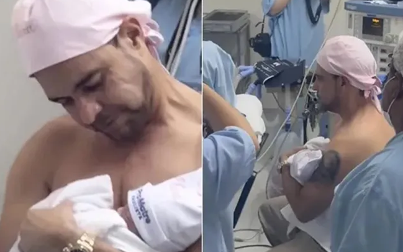 Nas imagens, o artista surgiu sem camisa ao segurar a filha ainda na sala de parto. Dado compartilhou a imagem para mostrar Wanessa Camargo fazendo reiki na madrasta Graciele Lacerda na maternidade depois da irmã vir ao mundo.