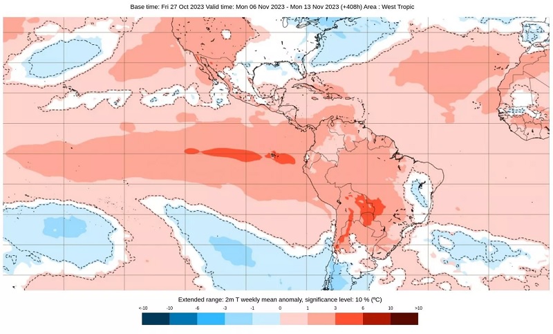 Mapa de anomalia de temperatura na América do Sul do modelo do Centro Meteorológico Europeu para a semana entre 20 e 27 de novembro | Foto:ECMWF